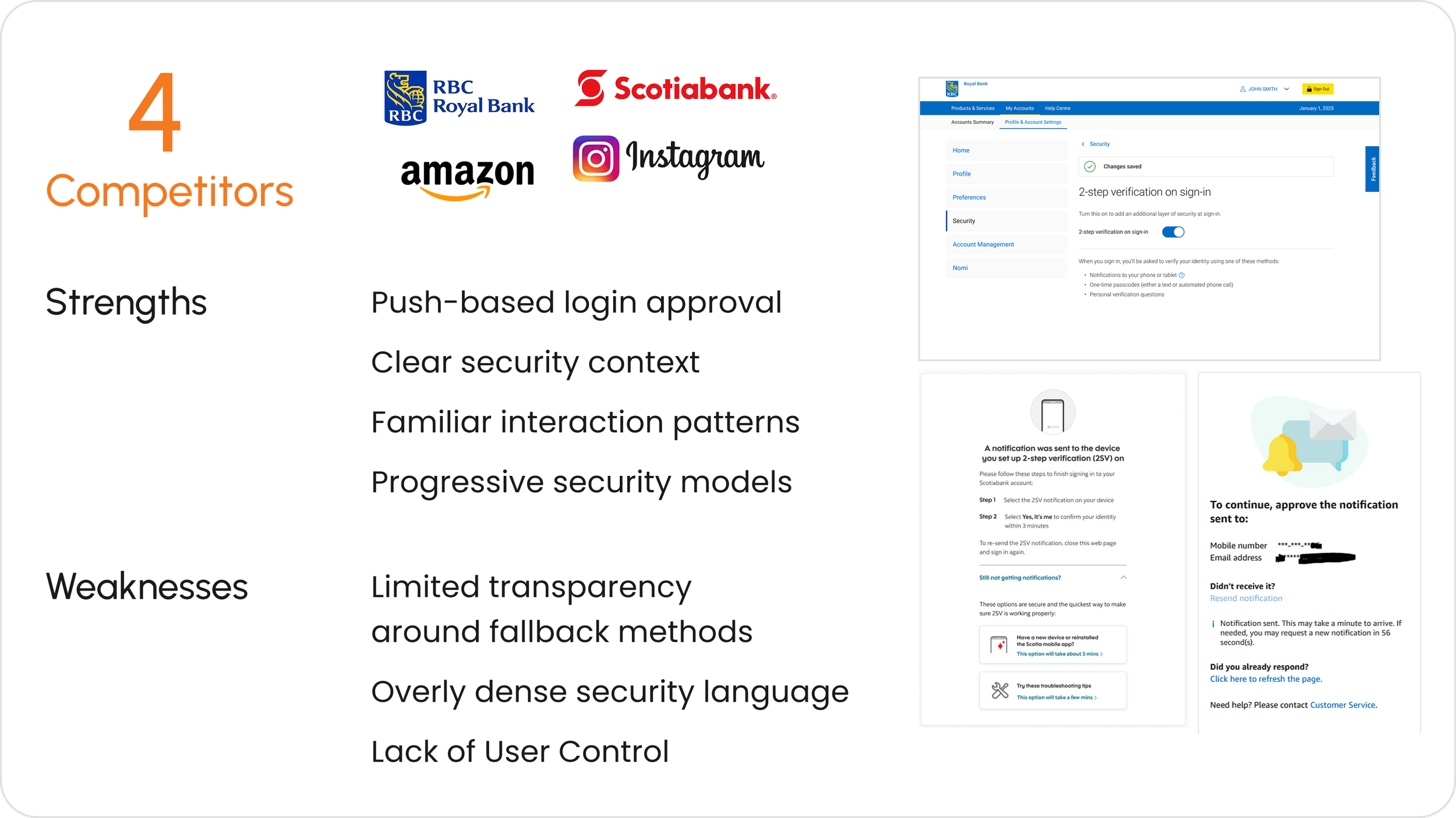 To push the thinking further, I also analyzed consumer tech leaders like Instagram and Amazon, who have set strong precedents for push-based login approvals, clear security language, and calm, confidence-building UX